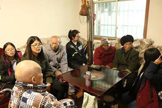 志愿者們分為清潔慰問組與炊事組兩組。清潔慰問組一部分打掃衛(wèi)生,一部分陪老人們聊天,傾聽老人們講述自己的經(jīng)歷以及與家人、孩子的故事,談話中老人們感慨現(xiàn)今生活的美好,教育志愿者們要學(xué)會(huì)珍惜。天氣晴朗,志愿者攙扶著老人在院里散步,還從室內(nèi)搬出長(zhǎng)凳,與老人共浴溫暖的陽(yáng)光。期間,老人們與志愿者情切交流,氣氛十分融洽,幾名志愿者在一位老爺爺?shù)膸ьI(lǐng)下,唱起了《東方紅》、《軍中綠花》等紅色革命歌曲。