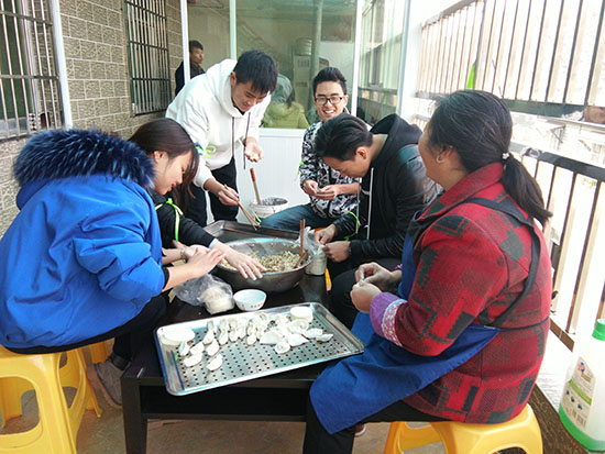 炊事組拿出提前備好的餃子餡和面團(tuán),熱熱鬧鬧地包起餃子。志愿者們嫻熟的拿起餃子皮,沾水、包餡、捏褶,準(zhǔn)備午飯。