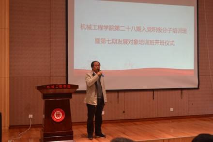機(jī)械工程學(xué)院網(wǎng)站訊(圖/文:趙師娟 王建/鄒醒佳)4月12日,機(jī)械工程學(xué)院第二十八期入黨積極分子培訓(xùn)班暨第七期發(fā)展對(duì)象培訓(xùn)班開班儀式在機(jī)械樓報(bào)告廳順利舉行。院黨委書記安明剛、黨政辦副主任董平、本科生輔導(dǎo)員干雪梅、研究生輔導(dǎo)員田森等出席儀式,開班儀式由學(xué)生科負(fù)責(zé)人岑曉潔主持。