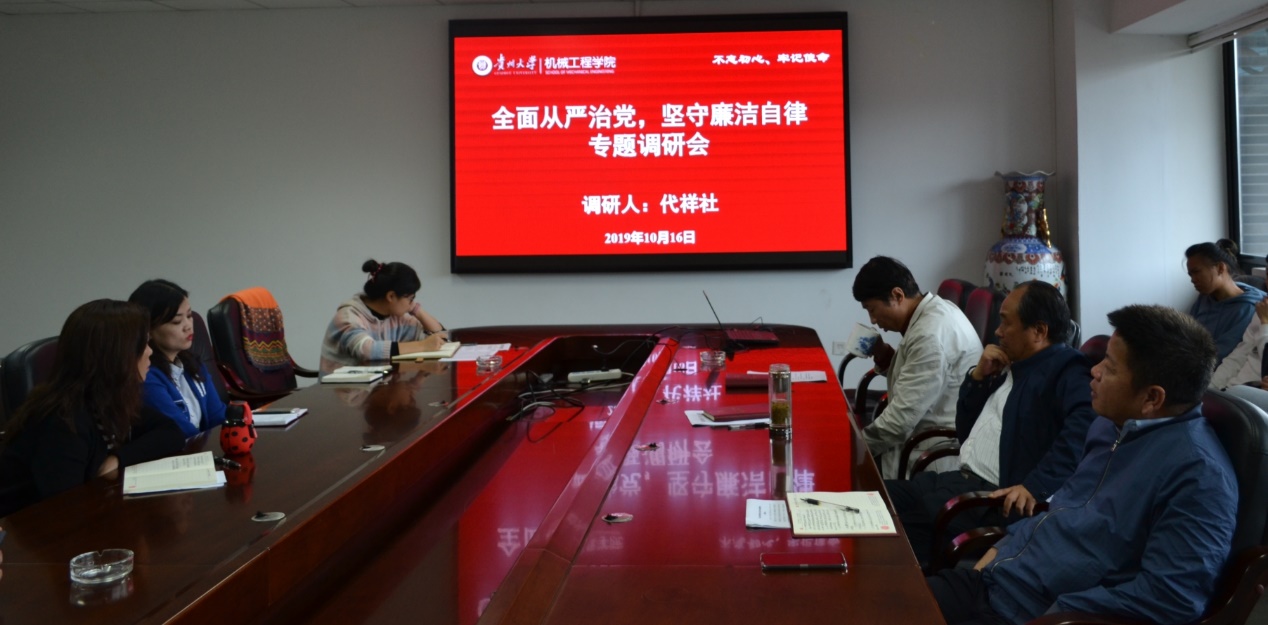 (記者 范順鑫|攝影 范順鑫 )為認(rèn)真落實(shí)中央、省委和貴州大學(xué)黨委的決策部署,扎實(shí)開(kāi)展學(xué)院“不忘初心、牢記使命”主題教育工作,根據(jù)機(jī)械工程學(xué)院黨委班子成員開(kāi)展主題教育調(diào)研方案,10月16日,機(jī)械工程學(xué)院黨委副書(shū)記代祥社在機(jī)械樓518會(huì)議室召開(kāi)“全面從嚴(yán)治黨,堅(jiān)守廉潔自律”專題調(diào)研會(huì),學(xué)院黨委書(shū)記安明剛、副院長(zhǎng)楊勤及各支部書(shū)記、學(xué)生黨員代表、教職工黨員代表參加了會(huì)議。