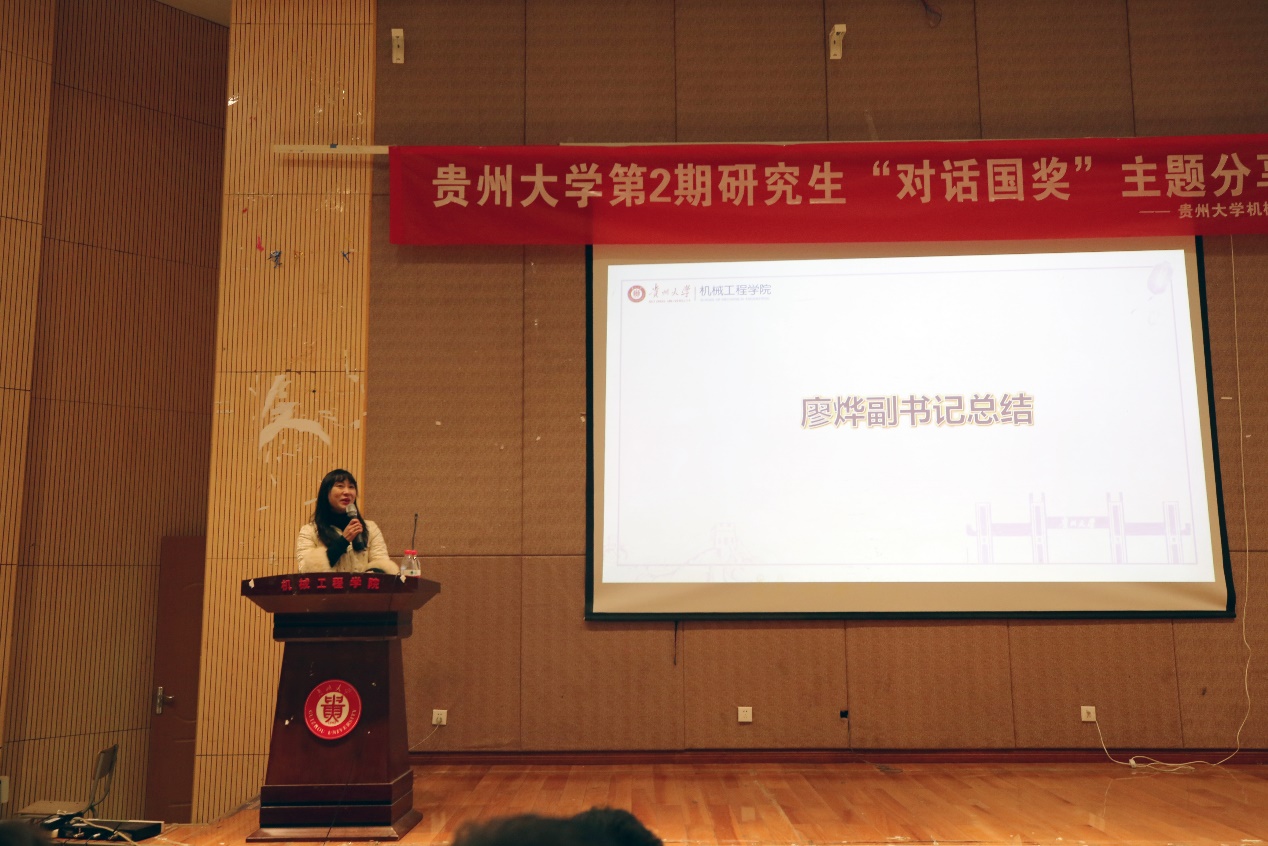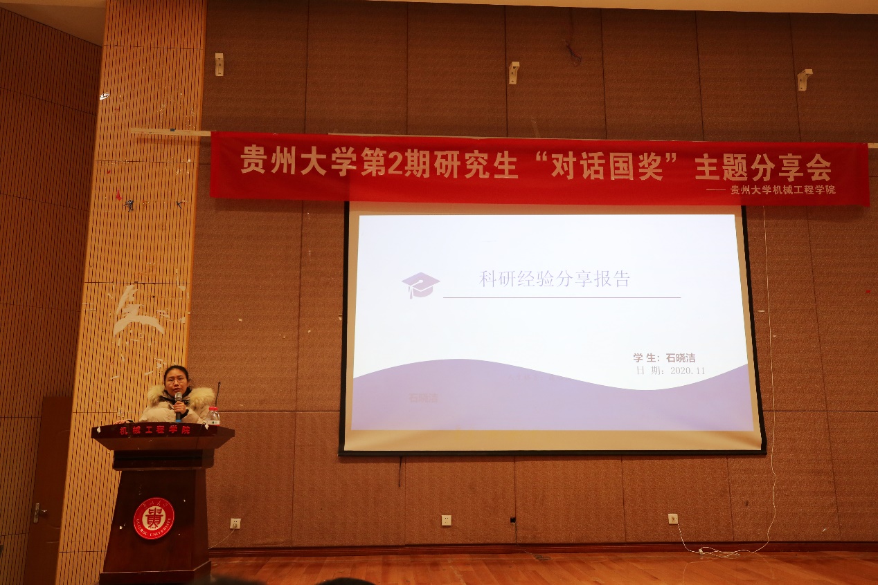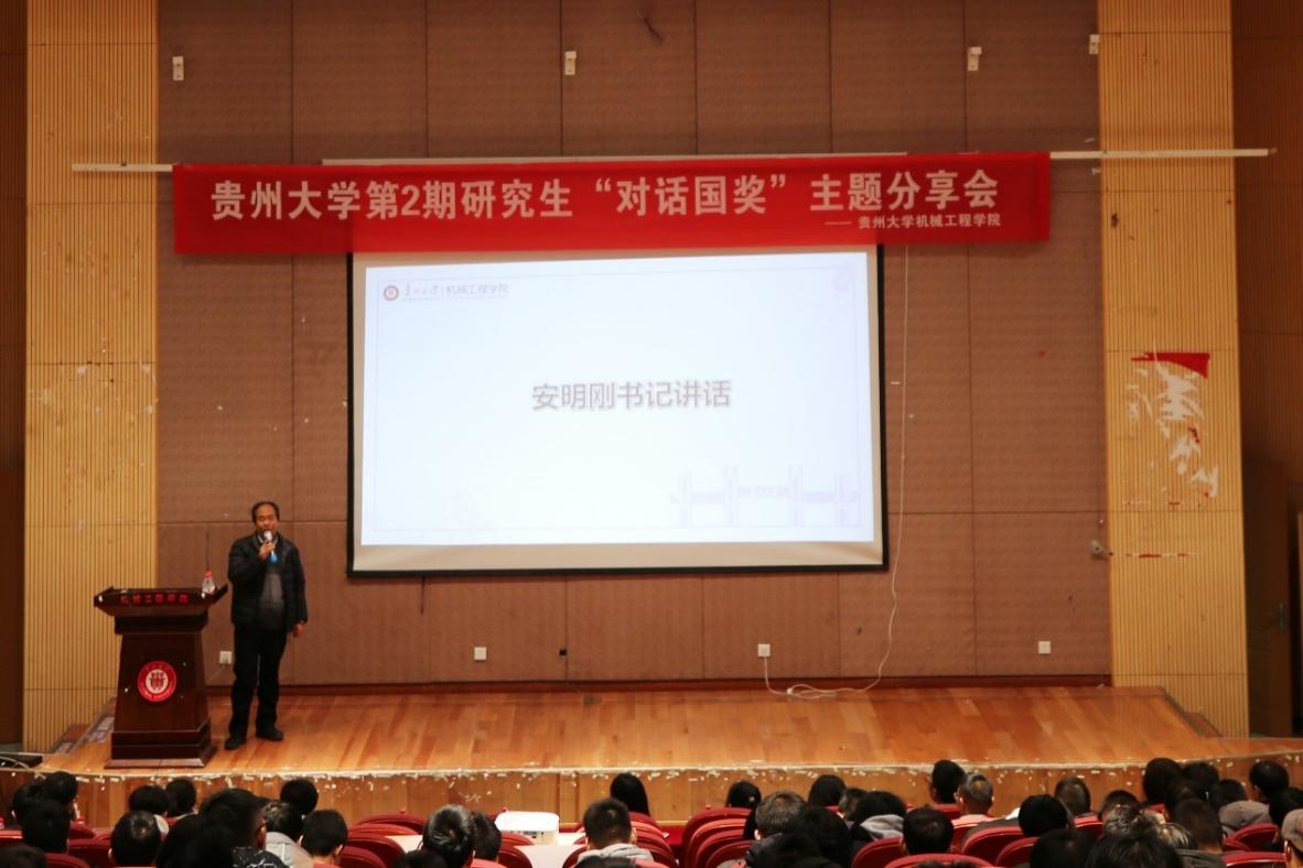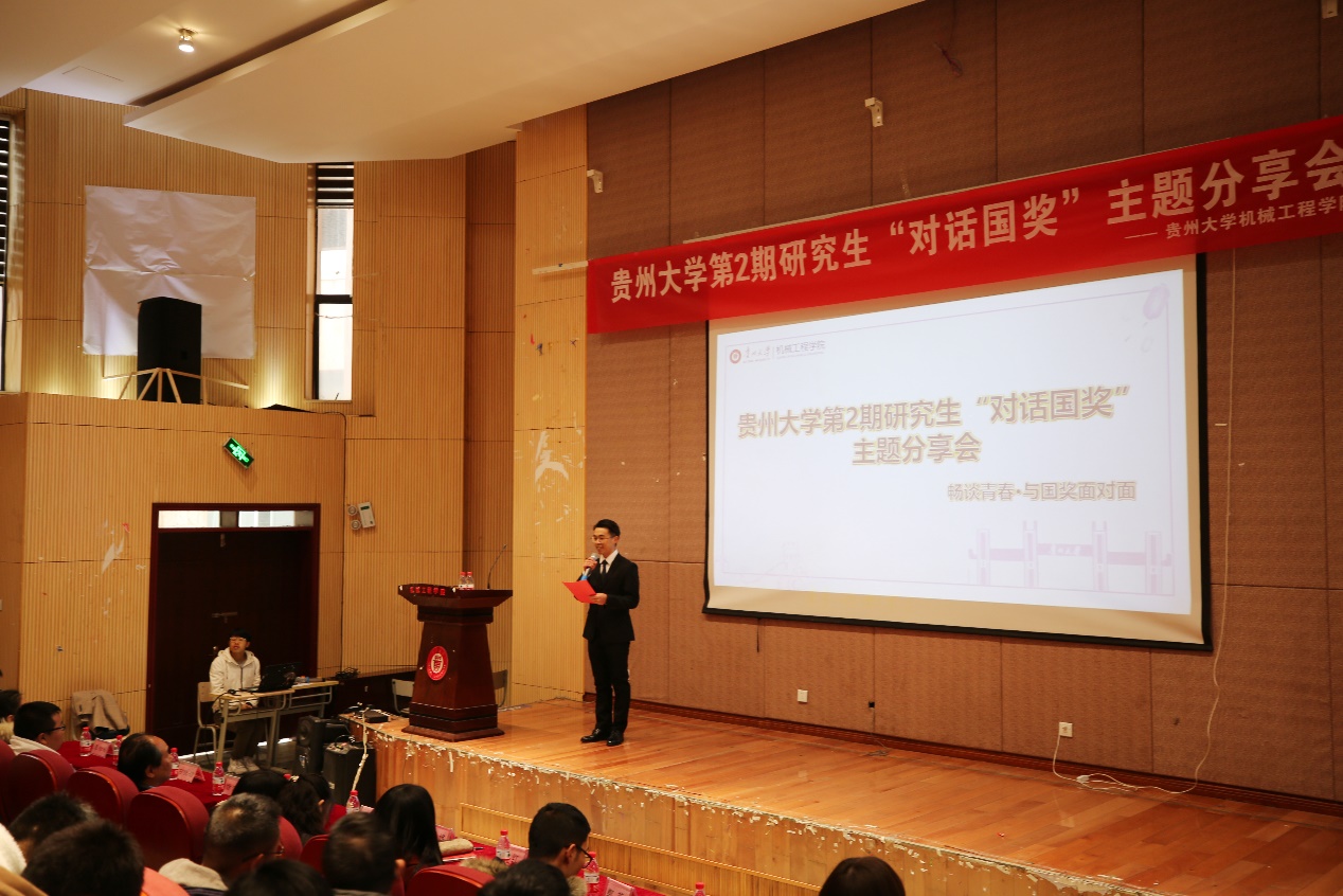 機(jī)械工程網(wǎng)站訊(記者 向檬|攝影 陳世婕)為進(jìn)一步加強(qiáng)我院學(xué)風(fēng)建設(shè),充分發(fā)揮優(yōu)秀研究生的引領(lǐng)示范作用。機(jī)械工程學(xué)院于2020年11月30日下午在學(xué)院圓形報(bào)告廳舉辦了貴州大學(xué)第2期研究生“對(duì)話國(guó)獎(jiǎng)”主題分享會(huì)。機(jī)械工程學(xué)院黨委書(shū)記安明剛、黨委副書(shū)記廖燁出席本次會(huì)議,研究生科權(quán)紅、郭蕊兩位老師以及學(xué)院全體研究生參加了會(huì)議,會(huì)議邀請(qǐng)了8名2019-2020年度國(guó)家獎(jiǎng)學(xué)金獲得者作經(jīng)驗(yàn)分享。