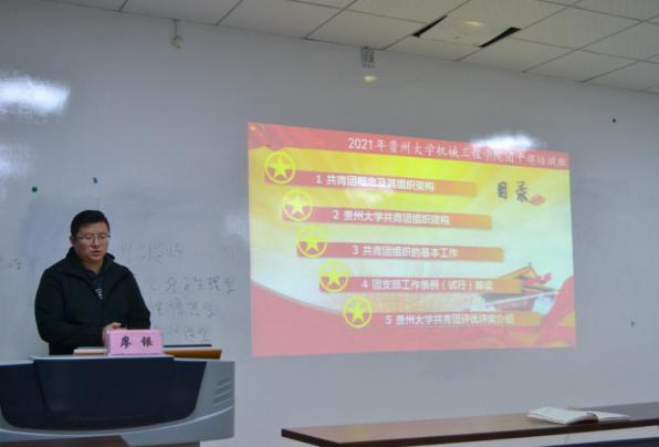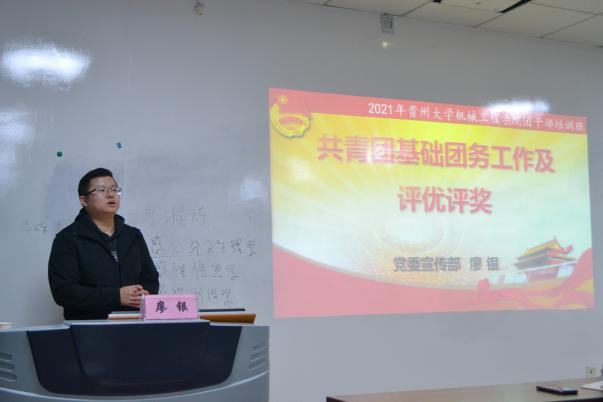 機械工程學(xué)院網(wǎng)站訊(記者 徐馳|攝影 徐馳)4月14日晚七點,機械工程學(xué)院在機械樓416舉行了團干部培訓(xùn)會。此次培訓(xùn)會特別邀請了貴州大學(xué)校團委組織部部長廖銀老師擔(dān)任主講老師。培訓(xùn)會由學(xué)生科何琳煜老師主持,學(xué)院各團支部書記、副書記、組織委員參加了此次培訓(xùn)。