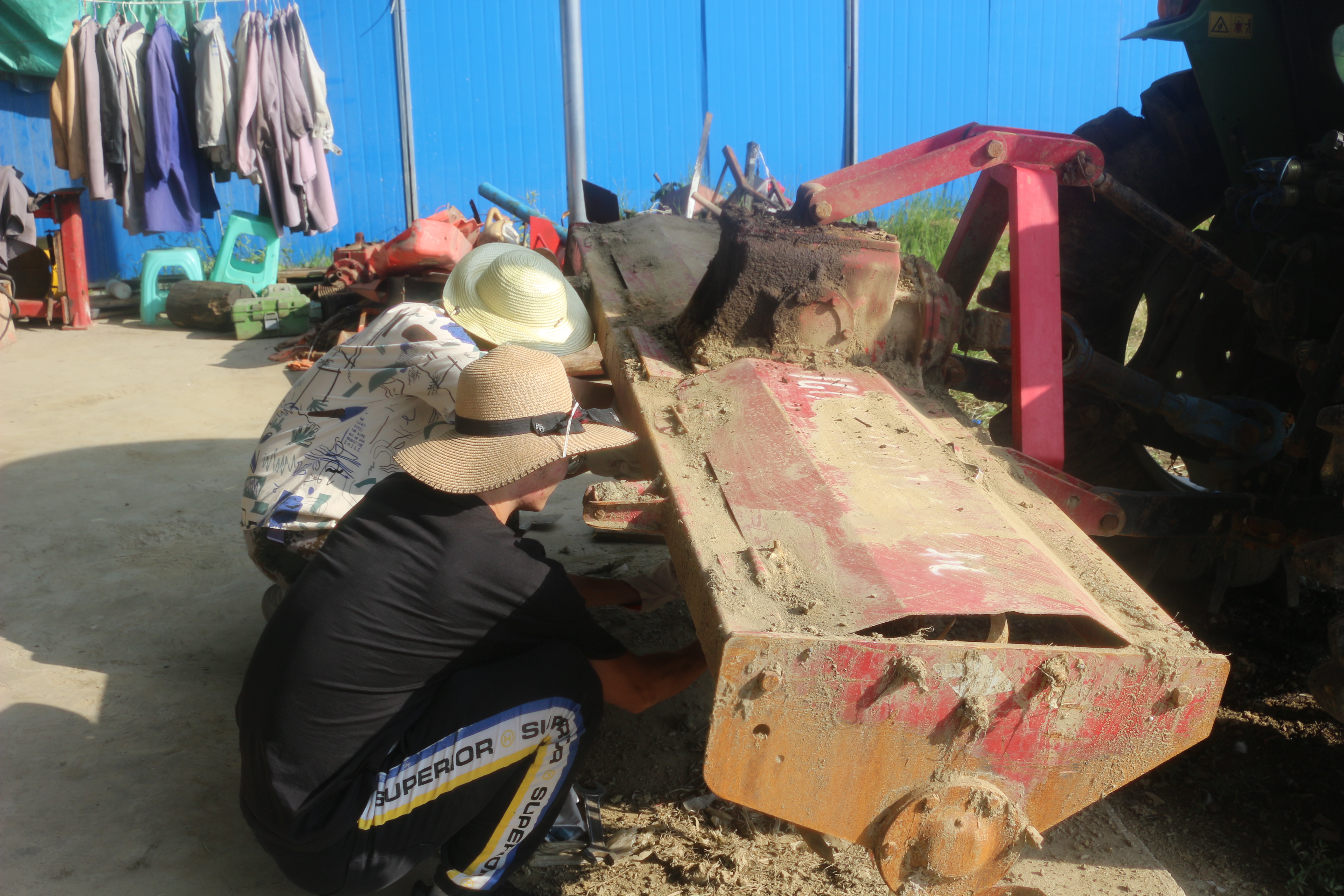 同學對農(nóng)機進行維修保養(yǎng)