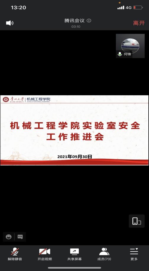 9月30日13:00,學(xué)院召開實(shí)驗(yàn)室安全工作線上專題推進(jìn)會(huì),黨委書記安明剛、院長李少波、副書記廖燁、副院長楊勤、何鋒出席會(huì)議,學(xué)院教師參加會(huì)議,會(huì)議由安明剛主持。會(huì)上,何鋒強(qiáng)調(diào)安全是保障師生們生命以及日常學(xué)習(xí)的生活的重要前提,要進(jìn)一步提高對(duì)安全工作重要性的認(rèn)識(shí),全院上下要樹立整體安全觀,不斷加強(qiáng)安全宣傳教育,做到人人皆知;不斷加強(qiáng)安全制度建設(shè),規(guī)范全院師生的安全行為,做到人人皆行;不斷深入開展工作,加強(qiáng)安全排查力度,對(duì)風(fēng)險(xiǎn)管控做到精準(zhǔn)識(shí)別。廖燁強(qiáng)調(diào)實(shí)驗(yàn)室安全無小事,一要提高政治站位,樹立安全穩(wěn)定是第一責(zé)任意識(shí);二要落實(shí)責(zé)任,開展自查自排工作,消除安全隱患;三要完善制度,建立相關(guān)臺(tái)賬。李少波指出,學(xué)院要完善管理模式、提升服務(wù)能力,要層層簽訂安全責(zé)任書,安全責(zé)任落實(shí)到人,開展安全大檢查。最后,安明剛強(qiáng)調(diào)要重新審視學(xué)院安全工作,并對(duì)學(xué)院安全工作提出更高要求,一要摸清底數(shù),清楚樓層教室安排、物品存放以及物品性質(zhì),明確負(fù)責(zé)人;二要提升安全意識(shí)和責(zé)任意識(shí),導(dǎo)師以及實(shí)驗(yàn)室管理人員要加強(qiáng)對(duì)學(xué)生和實(shí)驗(yàn)室的管理;三是強(qiáng)調(diào)國慶學(xué)生安全以及疫情防控相關(guān)要求。會(huì)后,學(xué)員班子成員對(duì)學(xué)院學(xué)生工作室、實(shí)驗(yàn)室開展安全大檢查。