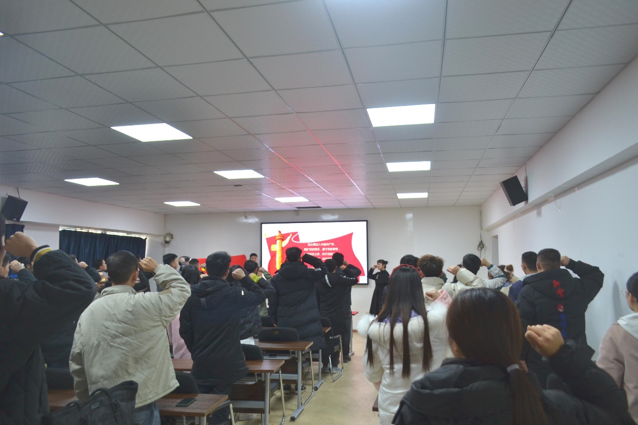 會(huì)議開始,新發(fā)展的預(yù)備黨員在廖燁的帶領(lǐng)下,莊嚴(yán)地舉起右拳,面向黨旗鄭重宣誓。