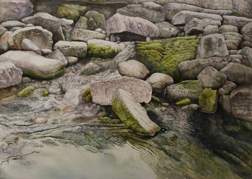 《溪流》畫面為靠近滕龍灣附近的花溪河,2021 第六屆水景繪畫在線大賽(美國)榮譽獎;2021年度(秋季)馬來西亞國際藝術網絡大賽《風景類》精彩作品。