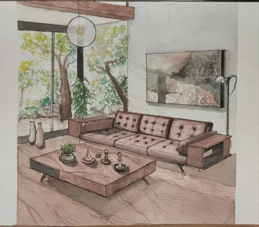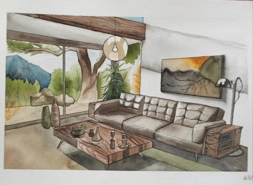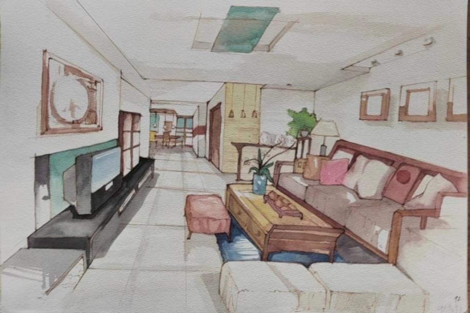 室內設計體現(xiàn)了現(xiàn)代的風格和設計理念,可以看到舒適的沙發(fā)、時尚的家具和裝飾品,以及柔和的燈光。整個畫面散發(fā)著溫馨和諧的氛圍,給人帶來愉悅和舒適的感覺。通過水彩的絢麗色彩和輕盈的筆觸,作品將觀眾帶入一個優(yōu)雅而舒適的室內空間。