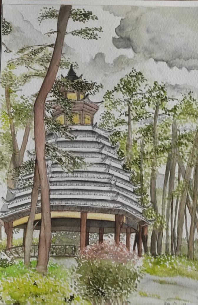 這幅作品取地貴州大學育賢廣場寫生,畫面中心是位于廣場中心的侗寨鼓樓。其獨特風格體現(xiàn)了中國傳統(tǒng)建筑的魅力。周圍環(huán)繞著郁郁蔥蔥的綠色植被和樹木,為整個場景增添了生機與活力。天空中密布的云為畫面增添了一種神秘而寧靜的氛圍,與地面的建筑和植被形成鮮明對比,進一步凸顯了自然與人文的和諧共存。整個畫面色彩柔和,構圖和諧,展現(xiàn)了一種平和與自然之美的感覺。