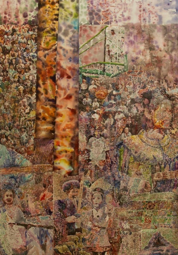 2022年,貴州省黔東南州臺盤鄉(xiāng)臺盤村舉辦貴州省“美麗鄉(xiāng)村”籃球聯(lián)賽?;鸨W,被稱之為“村BA”?!按?/span>BA”由“六月六”吃新節(jié)籃球賽演變而來,已有百年歷史。畫面上方描繪了密密麻麻的觀眾,左中下方為幾個表演反排木鼓舞的村民,中間為一個籃球架和打籃球的選手,右方是一個微笑著表演侗家琵琶音的姑娘。畫面用斑斕的色彩表現(xiàn)了多彩貴州豐富燦爛的民族文化,也表達了作者希望傳統(tǒng)民族文化在新時代煥發(fā)出新的生機活力,綻放出更加迷人的光彩的愿望。