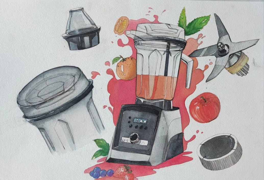 這張圖片展示了一臺水彩畫風格的榨汁機。主體色調通透,給人一種清新自然而又現(xiàn)代的感覺。內部放著顏色鮮艷的小番茄,增添了畫面的色彩對比,使畫面充滿生機和活力。