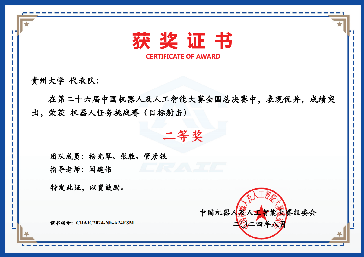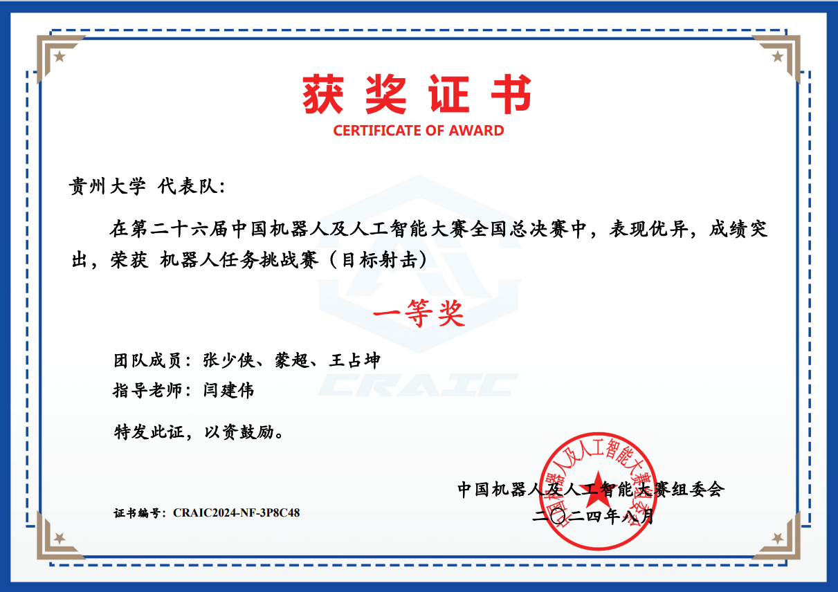 2 | 機(jī)器人任務(wù)挑戰(zhàn)賽(目標(biāo)射擊) | CRAIC20241AYRR5JB | 張少俠、蒙超、王占坤 | 全國一等獎 |