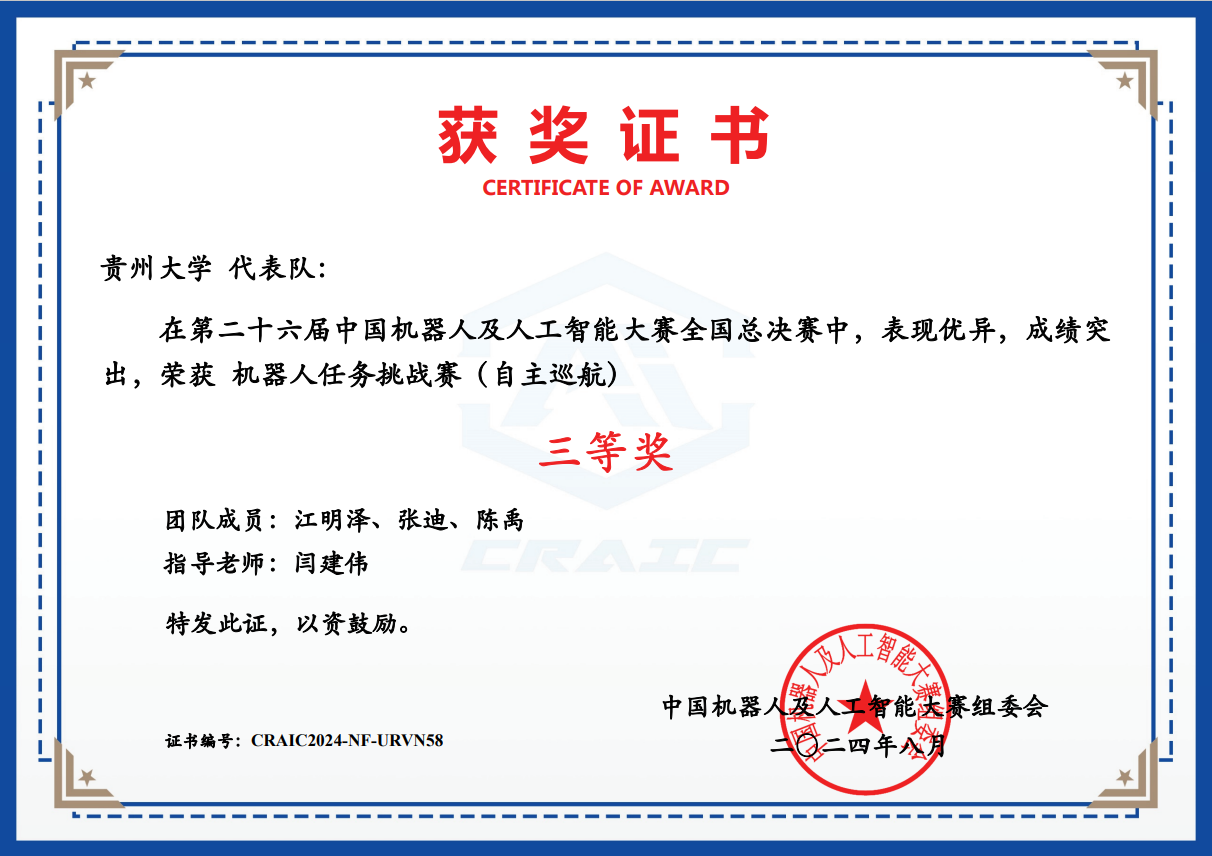 6 | 機(jī)器人任務(wù)挑戰(zhàn)賽(自主巡航) | CRAIC2024PMI5BXKX | 江明澤、張迪、陳禹 | 全國三等獎 |