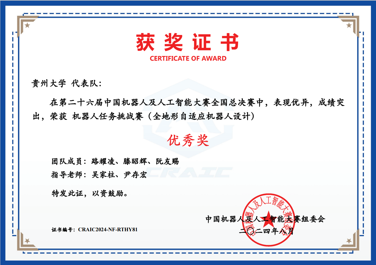 7 | 機(jī)器人任務(wù)挑戰(zhàn)賽(全地形自適應(yīng)機(jī)器人設(shè)計(jì)) | CRAIC20249Y4HPBFI | 趙梓衡、滕勇軍、米小紅 | 全國三等獎 |