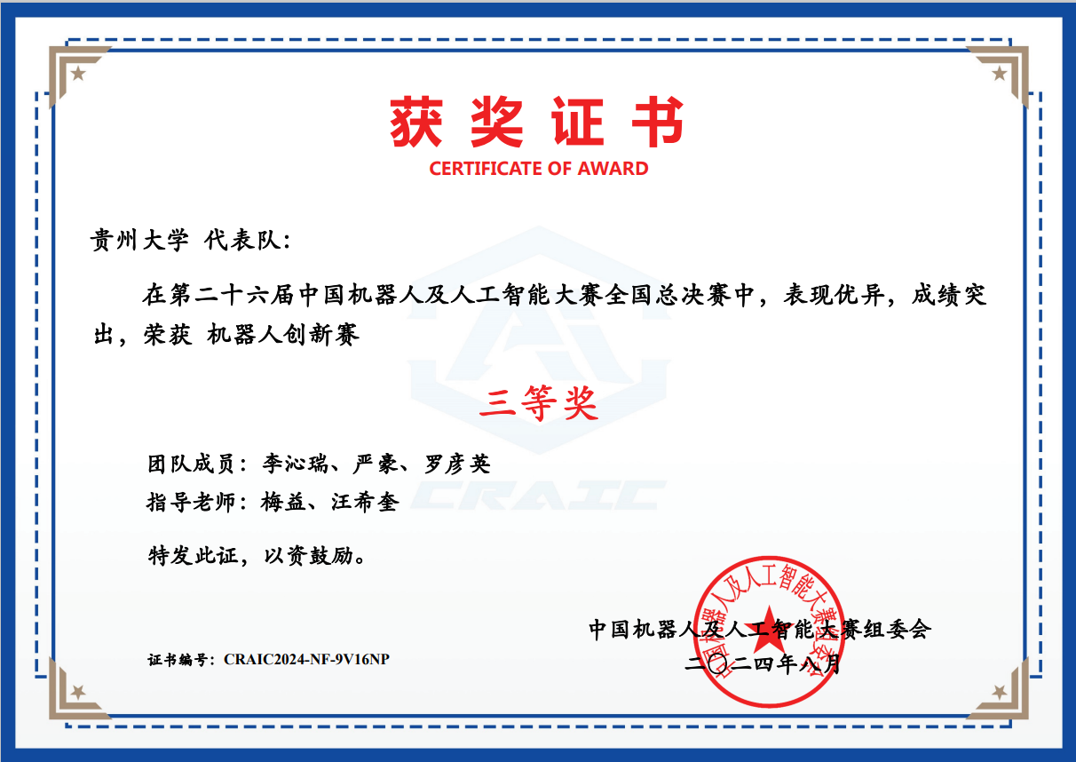 8 | 機(jī)器人創(chuàng)新賽 | CRAIC2024TVCKGBPC | 李沁瑞、嚴(yán)豪、羅彥英 | 全國三等獎 |