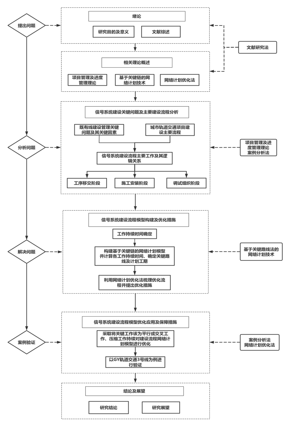 論文通過項(xiàng)目管理理論并結(jié)合既有線的建設(shè)經(jīng)驗(yàn)對(duì)城市軌道交通信號(hào)系統(tǒng)建設(shè)項(xiàng)目的主要建設(shè)階段及工作內(nèi)容進(jìn)行梳理,確定了各工作之間的邏輯關(guān)系;以正在建設(shè)的GY3號(hào)線一期工程信號(hào)系統(tǒng)為例,從建設(shè)單位角度采用基于關(guān)鍵路線法的網(wǎng)絡(luò)計(jì)劃技術(shù)建立了城市軌道交通信號(hào)系統(tǒng)建設(shè)流程網(wǎng)絡(luò)計(jì)劃模型,同時(shí)計(jì)算各工作的時(shí)間參數(shù)并確定關(guān)鍵路線及工期。論文在模型計(jì)劃工期不滿足既定工期的情況下,采用網(wǎng)絡(luò)計(jì)劃優(yōu)化技術(shù)對(duì)信號(hào)系統(tǒng)建設(shè)流程關(guān)鍵路線上的關(guān)鍵工作進(jìn)一步分解,對(duì)分解后的工作采用平行或交叉作業(yè)方式重新確定邏輯關(guān)系;并結(jié)合信號(hào)系統(tǒng)各聯(lián)鎖區(qū)的施工及調(diào)試工程量壓縮部分關(guān)鍵路線上關(guān)鍵工作的持續(xù)時(shí)間;最終使得優(yōu)化后的信號(hào)系統(tǒng)建設(shè)流程模型工期滿足既定工期要求。同時(shí)為避免非關(guān)鍵路線由于不可控因素變?yōu)殛P(guān)鍵路線進(jìn)而影響信號(hào)系統(tǒng)的建設(shè)工期,結(jié)合現(xiàn)場(chǎng)實(shí)際對(duì)非關(guān)鍵路線上的工作采取相應(yīng)保障措施,最終在既定工期內(nèi)完成了信號(hào)系統(tǒng)的建設(shè)任務(wù)。論文采用基于關(guān)鍵路線法建立的信號(hào)系統(tǒng)建設(shè)流程網(wǎng)絡(luò)計(jì)劃模型具有可操作性和可實(shí)施性,切實(shí)有效地指導(dǎo)信號(hào)系統(tǒng)按期完成工程建設(shè)任務(wù),同時(shí)可為行業(yè)內(nèi)其他參建單位提供參考,具有一定實(shí)際意義。