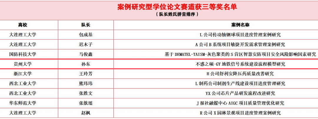 比賽設(shè)六個(gè)平行“主題賽道”。學(xué)院首次嘗試指導(dǎo)工程管理專業(yè)學(xué)生參賽,選擇了“案例研究型學(xué)位論文”賽道。參賽期間我院梅益教授、楊觀賜教授和李少波教授等指導(dǎo)工程管理專業(yè)學(xué)生不斷打磨論文。2021級(jí)工程管理專業(yè)孫東同學(xué)的論文《GY地鐵信號(hào)系統(tǒng)建設(shè)流程模型研究》獲得全國三等獎(jiǎng),實(shí)現(xiàn)了工程管理重大賽項(xiàng)零的突破。