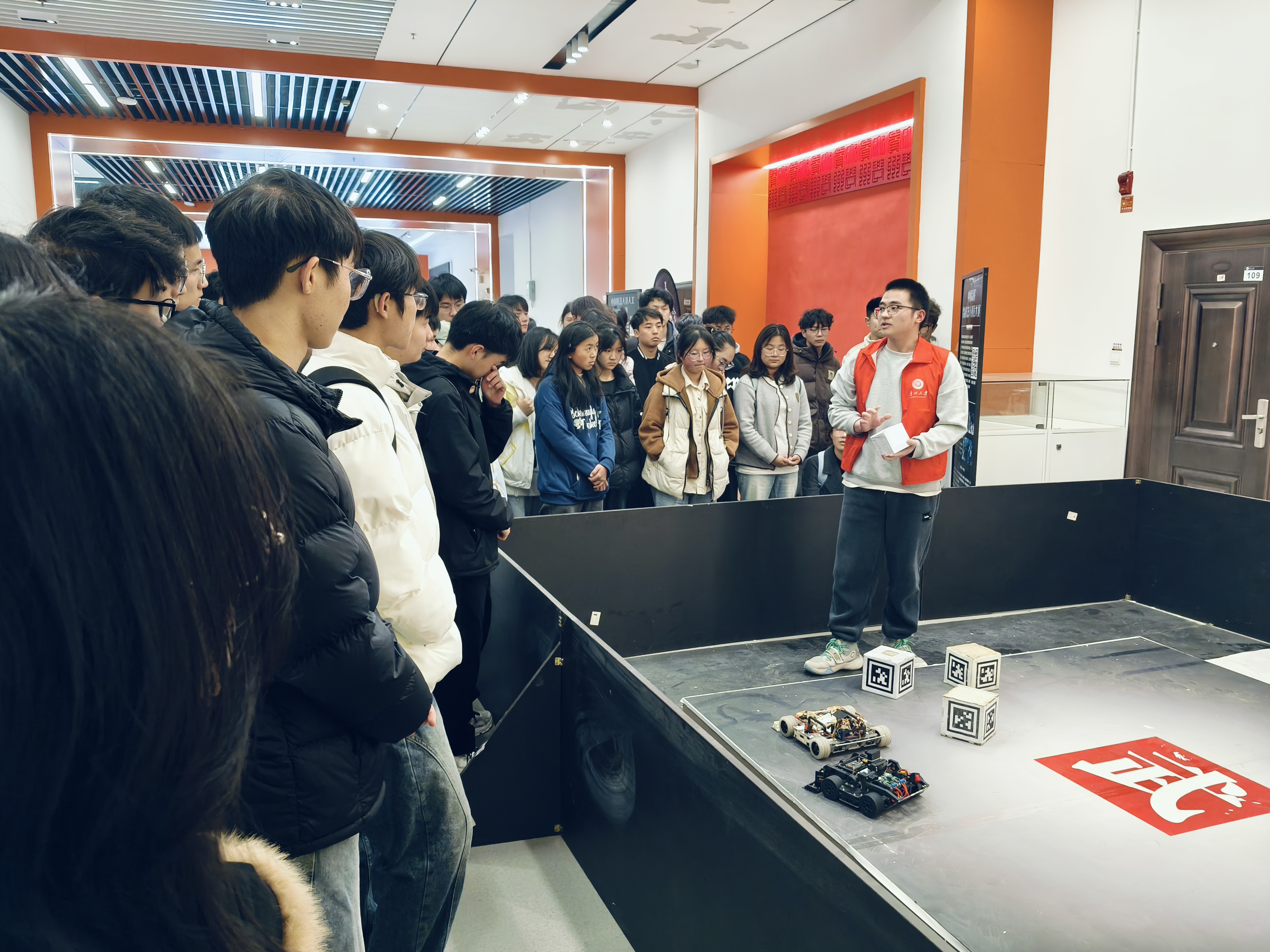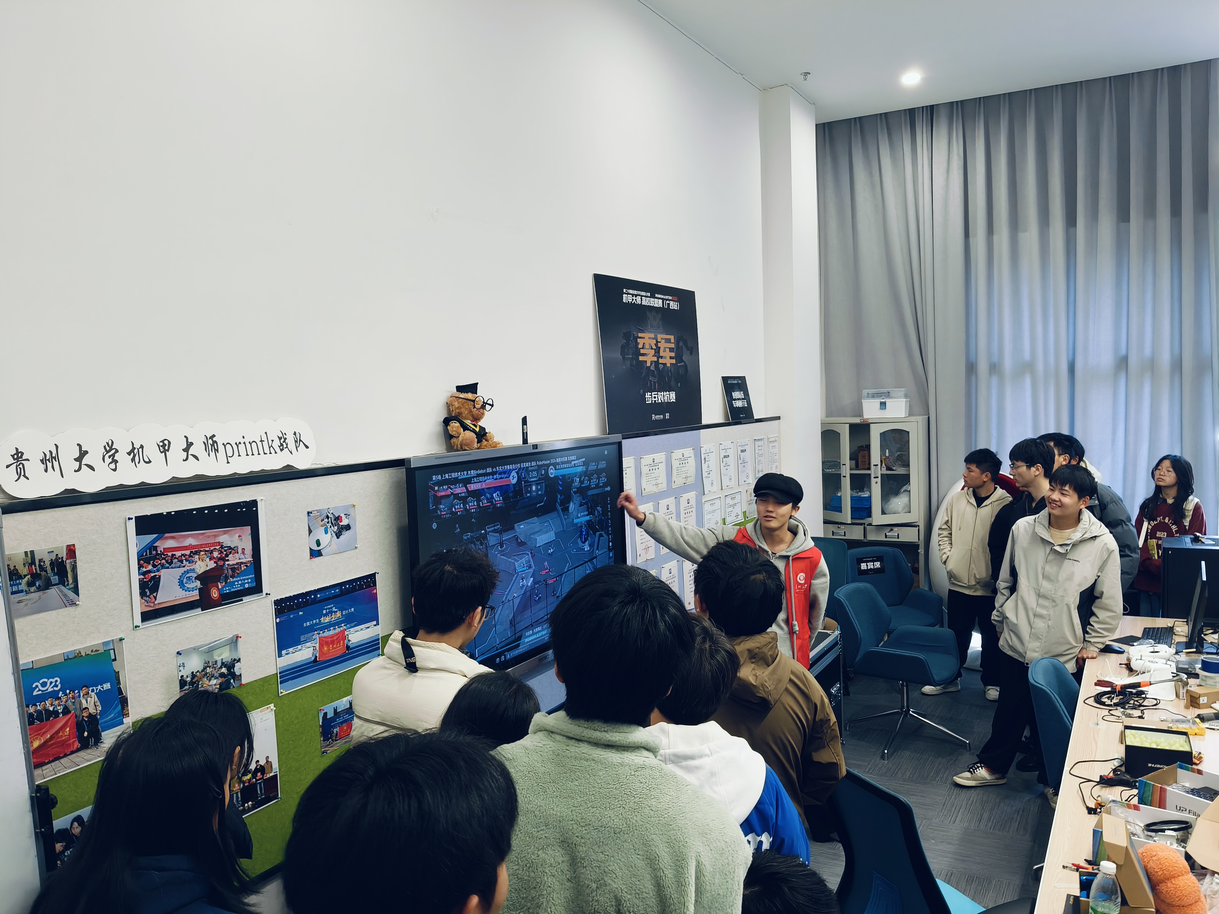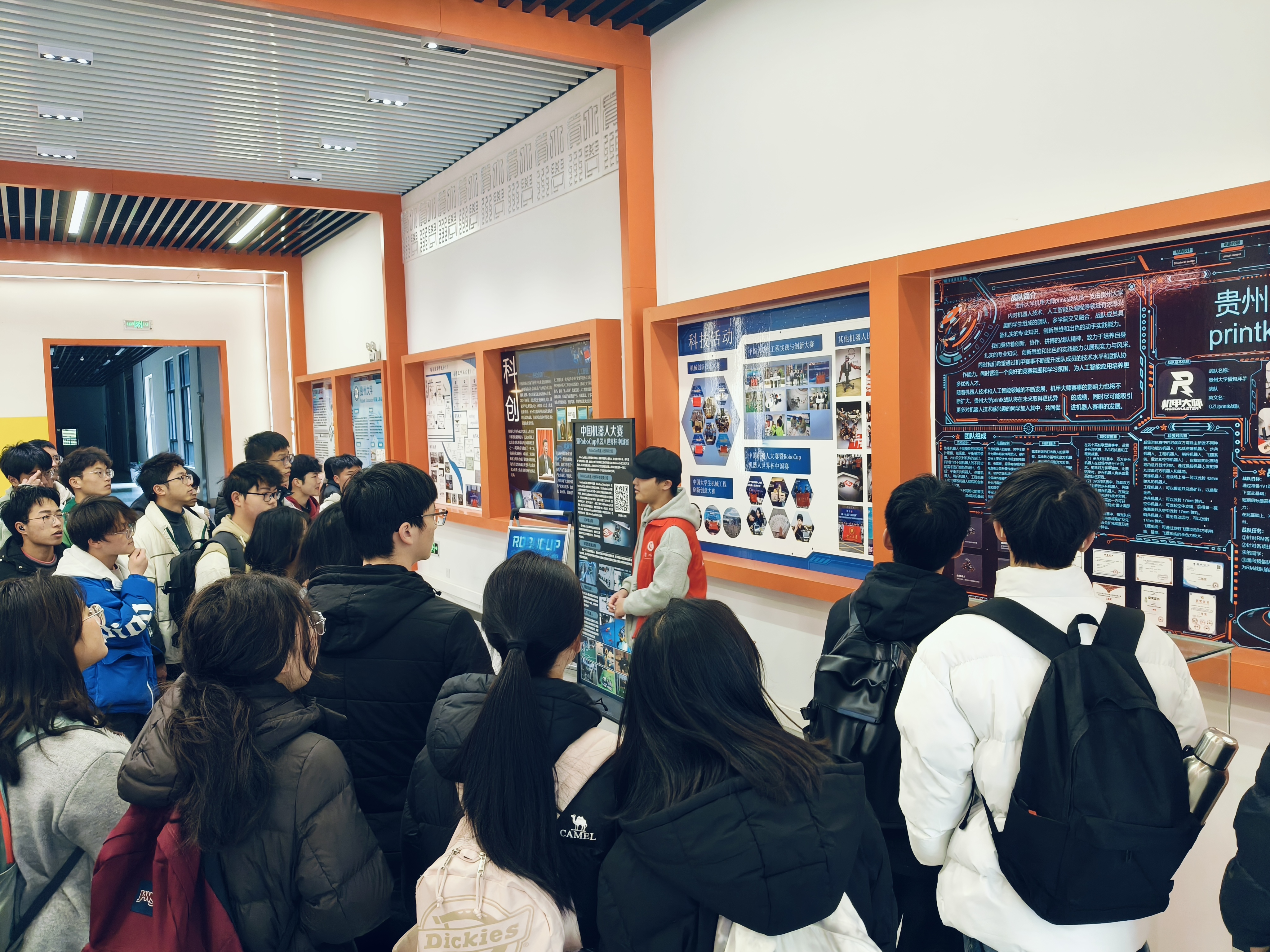 正式介紹優(yōu)秀作品前,馭想俱樂(lè)部負(fù)責(zé)人楊春白雪向同學(xué)們介紹習(xí)近平總書(shū)記給中國(guó)國(guó)際大學(xué)生創(chuàng)新大賽參賽學(xué)生代表回信內(nèi)容。隨后楊春白雪和機(jī)器人社團(tuán)負(fù)責(zé)人田景怡分別對(duì)兩個(gè)科創(chuàng)社團(tuán)進(jìn)行了介紹并對(duì)相關(guān)賽事進(jìn)行解讀,還向大家展示了貴州大學(xué)代表隊(duì)的獲獎(jiǎng)作品。在參觀robomaster工作室時(shí),獎(jiǎng)杯墻令人震撼。同學(xué)們表示一個(gè)個(gè)獎(jiǎng)杯背后的故事更令人欽佩,激勵(lì)機(jī)械青年守正創(chuàng)新,再創(chuàng)佳績(jī)。