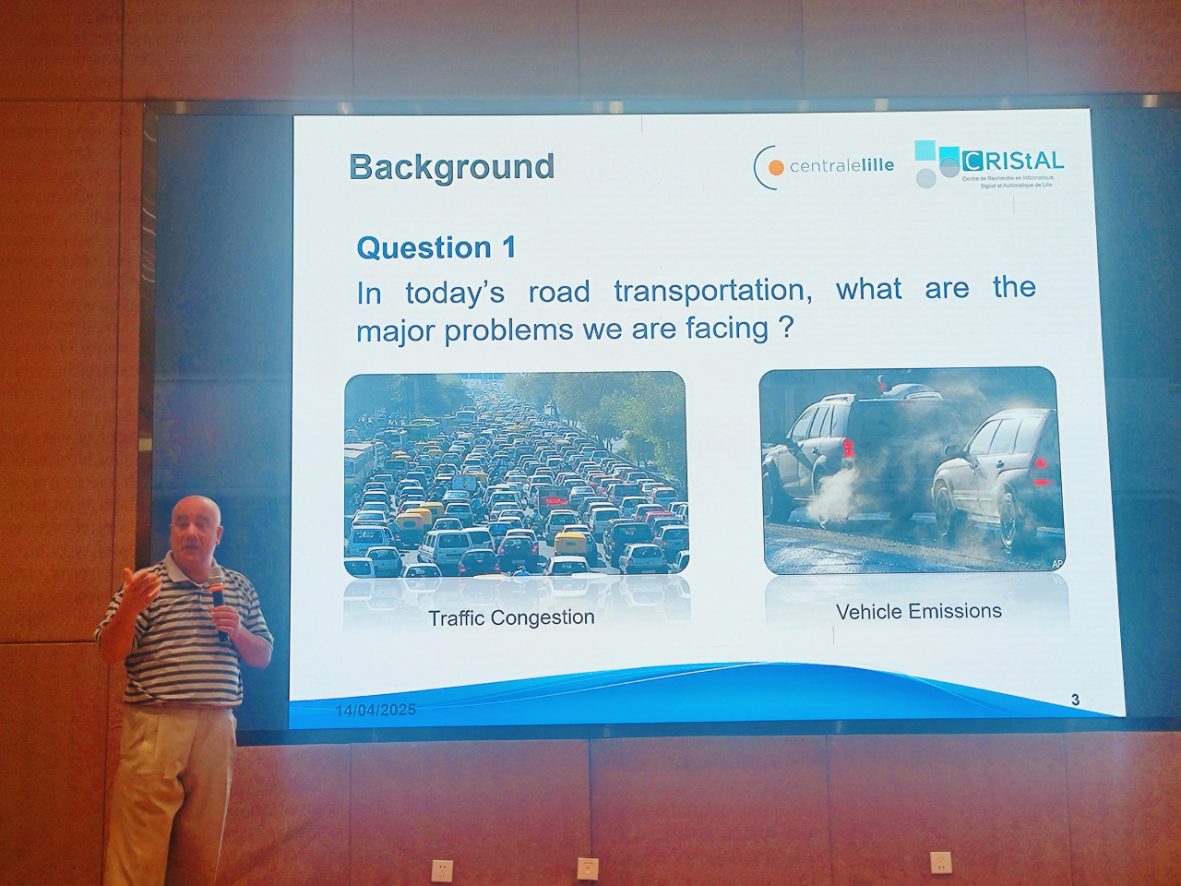 A. EL KAMEL教授首先介紹了智能交通系統(tǒng)(ITS)的背景和關鍵方面。他指出,當前道路交通面臨諸多挑戰(zhàn),如交通擁堵和車輛排放問題。這些問題不僅影響交通效率,還對環(huán)境和人類健康造成負面影響。他強調,通過智能交通系統(tǒng)的控制與優(yōu)化,可以有效緩解這些問題。