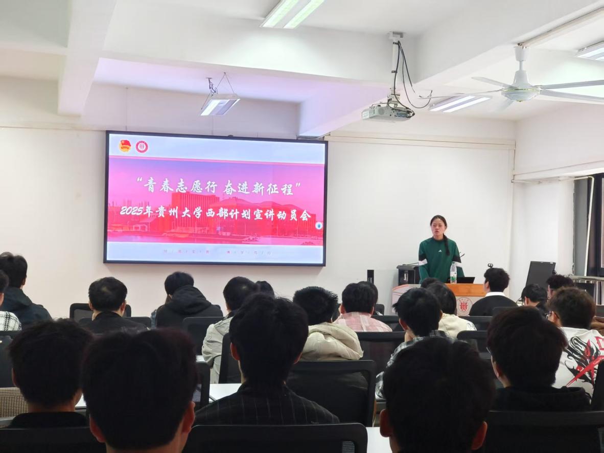 宣講會上,學院團委書記周士力老師以“青春志愿行 奮進新征程”為主題,系統(tǒng)解讀西部計劃政策框架。從招募對象、服務內(nèi)容、崗位分配,到生活補貼、考研加分、就業(yè)扶持等政策保障,通過圖文展示與案例解析,全面呈現(xiàn)西部計劃的服務體系。重點結(jié)合鄉(xiāng)村振興、基礎教育、基層治理等國家戰(zhàn)略需求,強調(diào)西部計劃對個人成長與國家發(fā)展的雙向價值。通過往屆志愿者經(jīng)歷分享,展現(xiàn)西部基層的工作圖景與成長收獲。同時播放共青團中央西部計劃宣傳片,展現(xiàn)西部壯美風光與志愿者風采,激發(fā)學子共鳴。