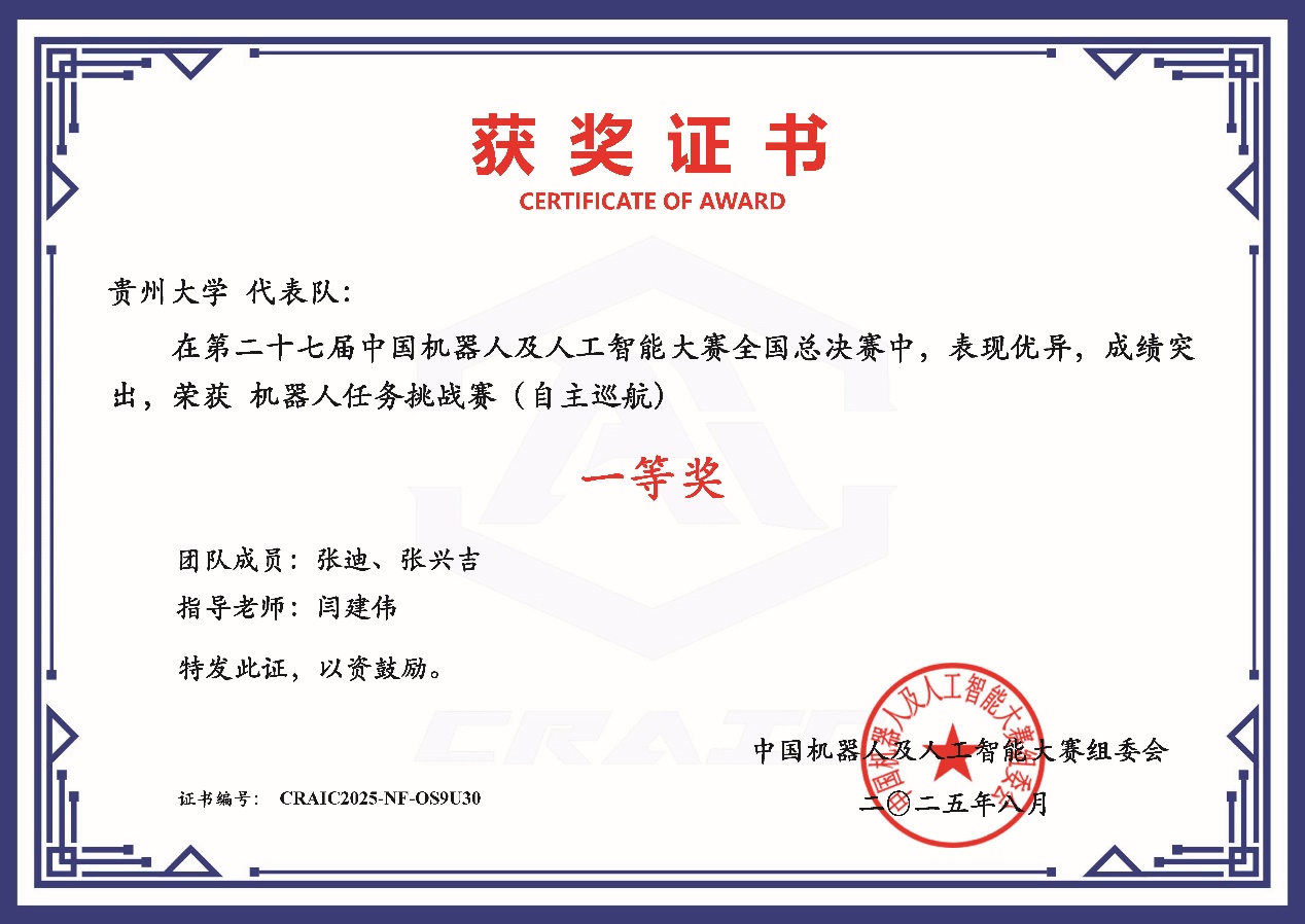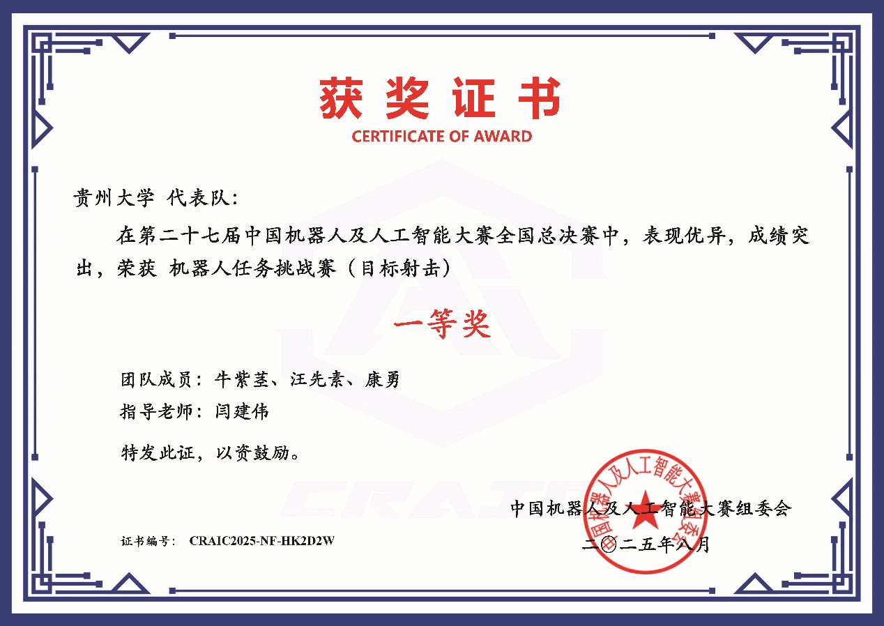機械工程學院各參賽隊伍成員和指導老師經(jīng)歷了長達半年多的辛苦備賽,經(jīng)過校、省、全國總決賽層層選拔和激烈角逐最終在2025年8月3日到8月22日舉行的第27屆CRAIC中國機器人及人工智能大賽全國總決賽中取得國賽一等獎3項、國賽二等獎8項、國賽三等獎3項,再創(chuàng)貴州大學參加該比賽國賽一等獎數(shù)量和獲獎總數(shù)的歷史新高。值得一提的是微型無人機賽道今年是首次參賽,由管彥銀擔任隊長的貴州大學小芯藝藝代表隊奪得貴州大學在此賽道中的首個國賽一等獎的好成績。