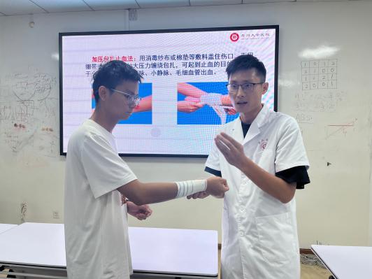 接著,姚云騫老師分享了關(guān)于“創(chuàng)傷救護(hù)”的急救知識(shí)。他普及一個(gè)“先救命,后治傷”的救護(hù)原則,并現(xiàn)場(chǎng)演示了直接壓迫止血,加壓包扎止血,8字包扎法,三角巾膝關(guān)節(jié)帶式包扎,骨折固定等救護(hù)方法。