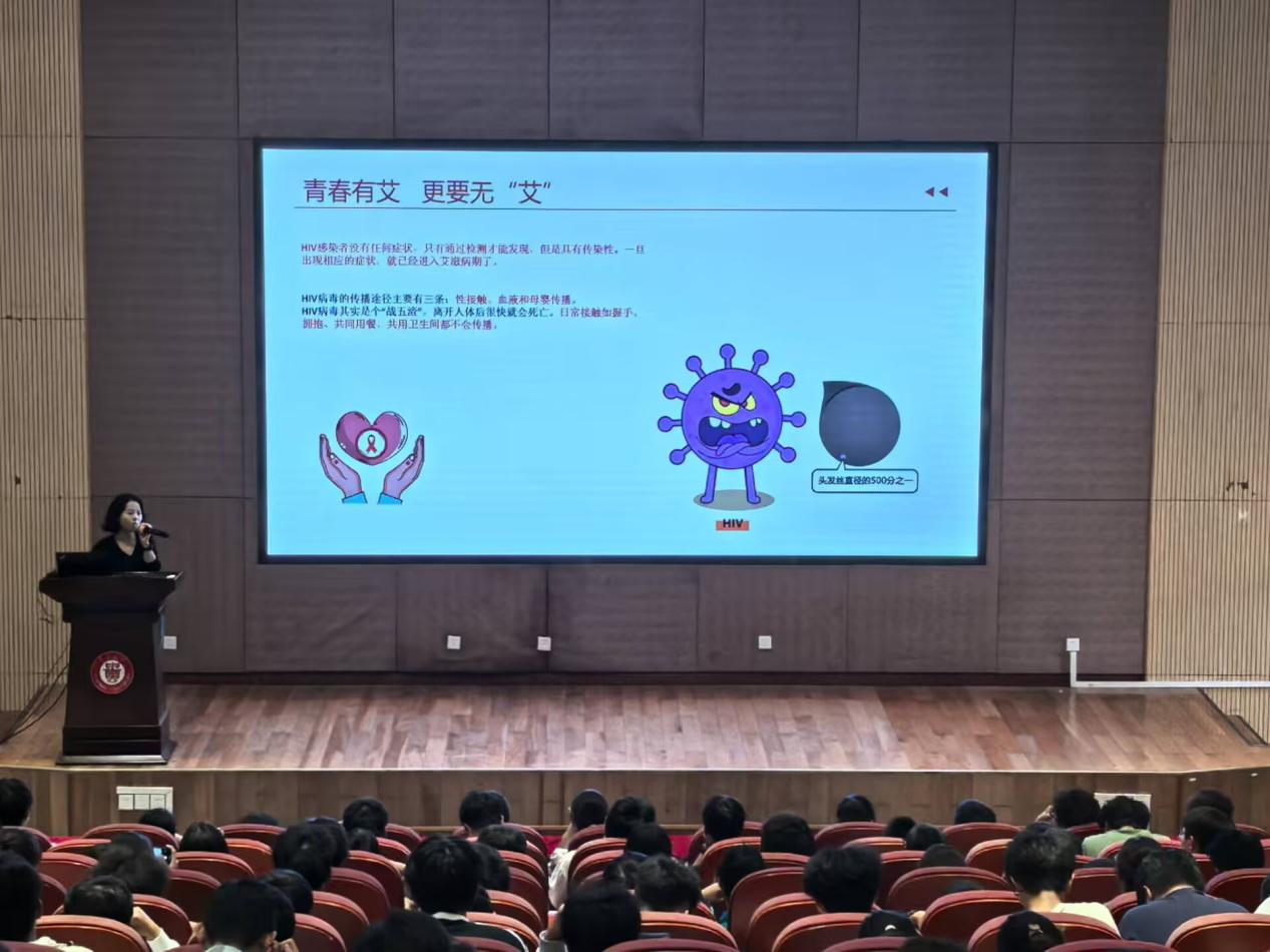 大會(huì)第二階段,學(xué)生科輔導(dǎo)員楊朵老師開(kāi)展防艾宣傳,從艾滋病的傳播途徑、預(yù)防措施、等方面進(jìn)行講解,著重強(qiáng)調(diào)樹(shù)立健康觀念、提高自我保護(hù)意識(shí)的重要性,引導(dǎo)新生們科學(xué)認(rèn)識(shí)艾滋病,養(yǎng)成良好的生活習(xí)慣,遠(yuǎn)離高危行為。同時(shí),輔導(dǎo)員楊朵老師還向新生們介紹校醫(yī)院公眾號(hào)的重要欄目及使用方法,方便新生日后隨時(shí)獲取醫(yī)療健康服務(wù)保障。